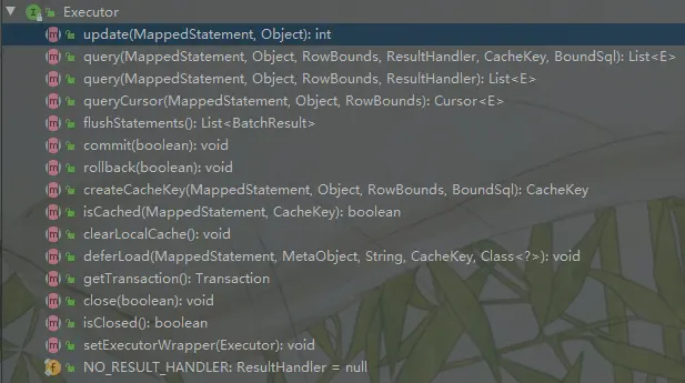 基础执行器实现了Executor接口,这个接口中有两个比较关键的方法,一个query方法,一个update方法: