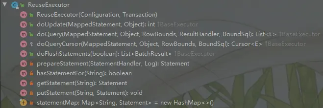ReuseExecutor 区别在于他会将在会话期间内的Statement进行缓存,并使用SQL语句作为Key。所以在相同会话内,执行下一请求的时候,不在重复构建Statement,而是从缓存中取出并设置参数,然后执行,提高性能。