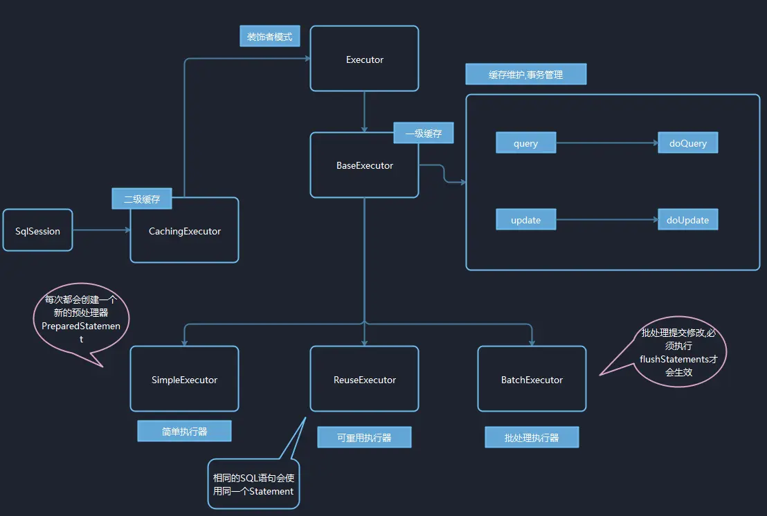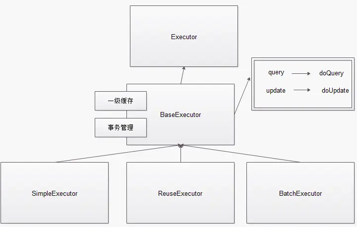 基础执行器的构成主要是query方法和update方法,和几个抽象方法doQuery和doUpdate方法,查询的时候先是调用query方法,处理完1级缓存逻辑后,再去调用doQuery方法,把真正查询数据库的逻辑交给(执行器的三个子类),分别是:SimpleExecutor(简单执行器)(默认执行器),ReuseExecutor(重用执行器),BatchExecutor(批处理执行器)其中一个。