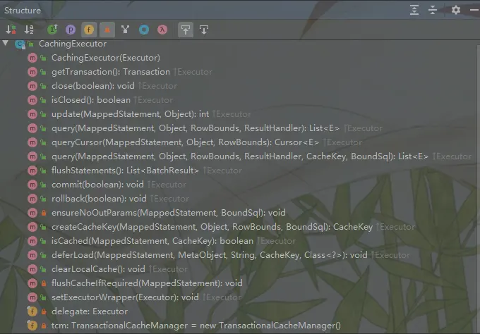 查看Executor 的子类还有一个CachingExecutor,这是用于处理二级缓存的。为什么不把它和一级缓存一起处理呢?因为二级缓存和一级缓存相对独立的逻辑,而且二级缓存可以通过参数控制关闭,而一级缓存是不可以的。综上原因把二级缓存单独抽出来处理。抽取的方式采用了装饰者设计模式,即在CachingExecutor 对原有的执行器进行包装,处理完二级缓存逻辑之后,把SQL执行相关的逻辑交给实至的Executor处理。