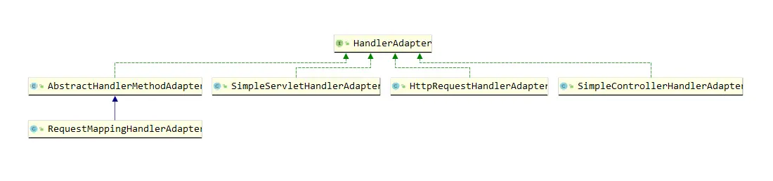 如下图所示, HandlerAdapter一共有5个实现类, 其中最难, 最重要的就是AbstractHandlerMethodAdapter这一派