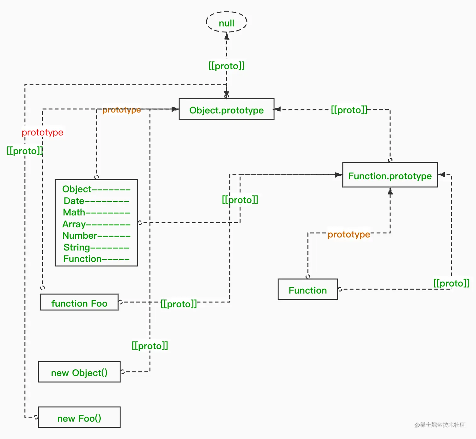 Object.prototype是原型链最顶端Object Date Math Function等内置构造函数 在原型链中 和function Foo是基本对等的, 都是有 构造起Function创建的,因此有Foo.__proto__ === Object.__proto__ === Function.__proto__ = Function.prototype;(注:Function构造器是Functiion本身)