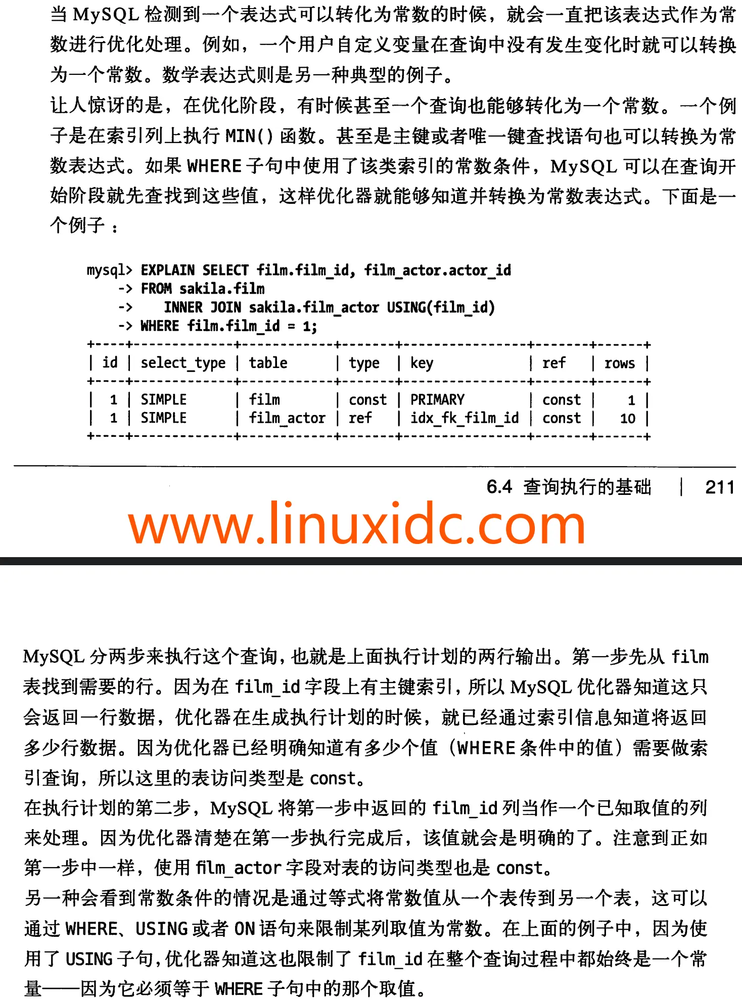 并不是所有的OUTER JOIN语句都必须以外链接的方式执行。例如WHERE条件、库表结构都可能会让一个外链接等价于一个内链接。MySQL能够识别这点并重写查询,让其可以调整关联顺序