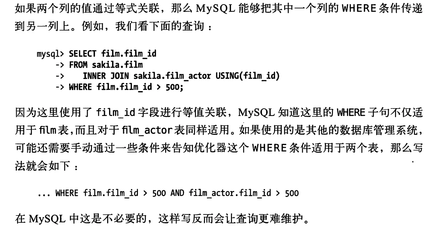 - 提前终止查询 在发现已经满足查询需求的时候,MySQL总是能够立即终止查询。比如limit子句,还比如不成立的条件