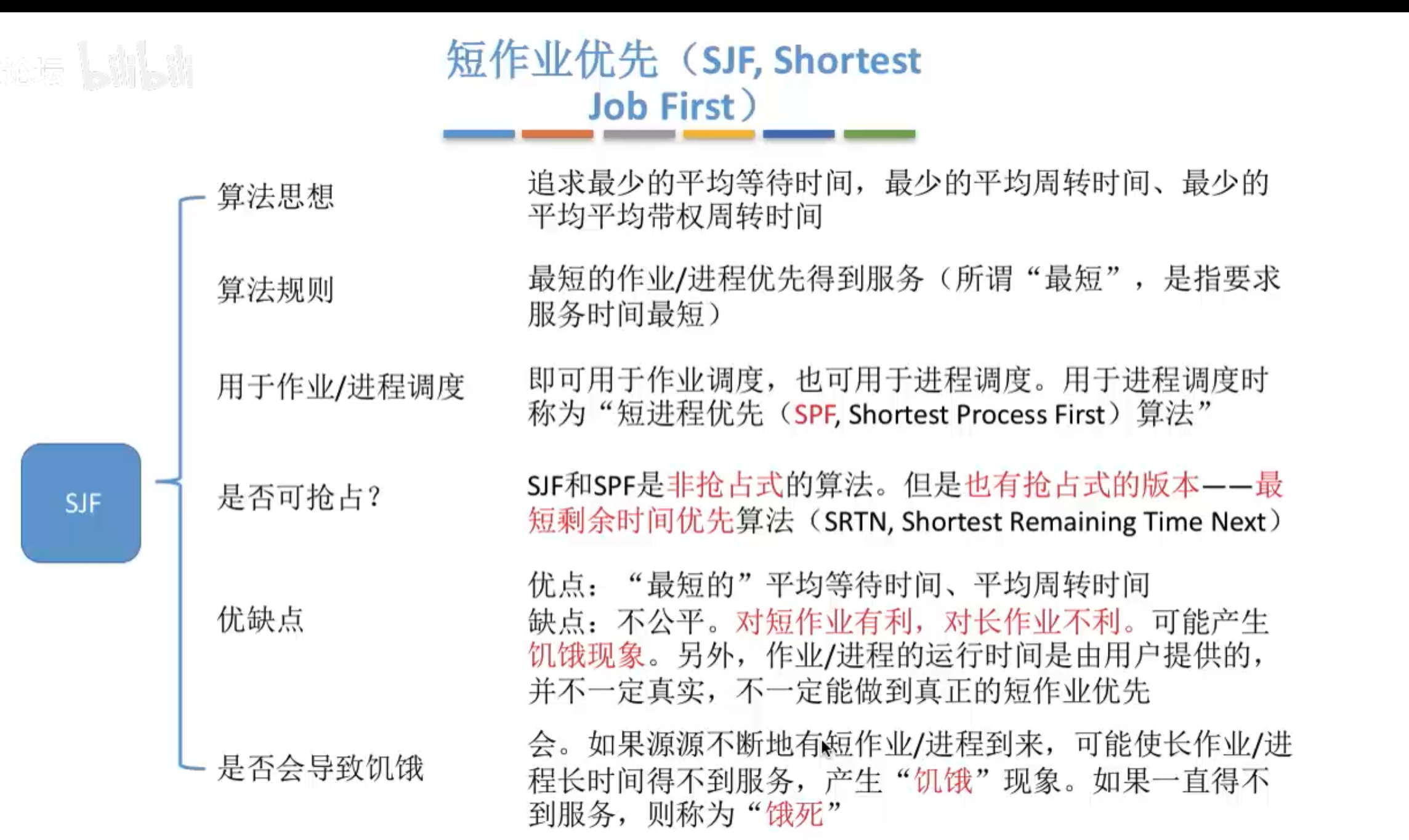 短作业优先算法考虑了每个进程的运行时间,没有考虑等待时间,对长作业不友好,有可能导致饿死
