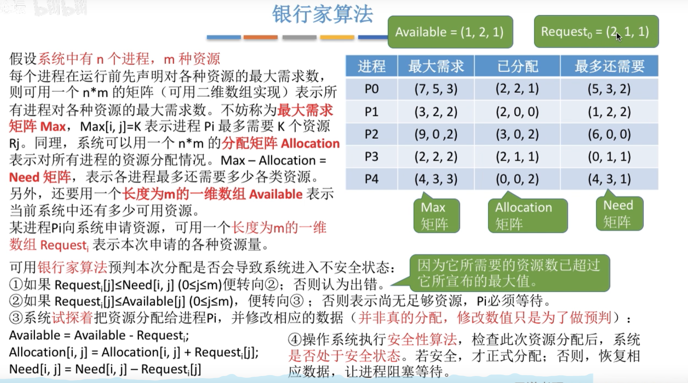 - 使用某种算法防止系统进入不安全状态,从而避免死锁(银行家算法)