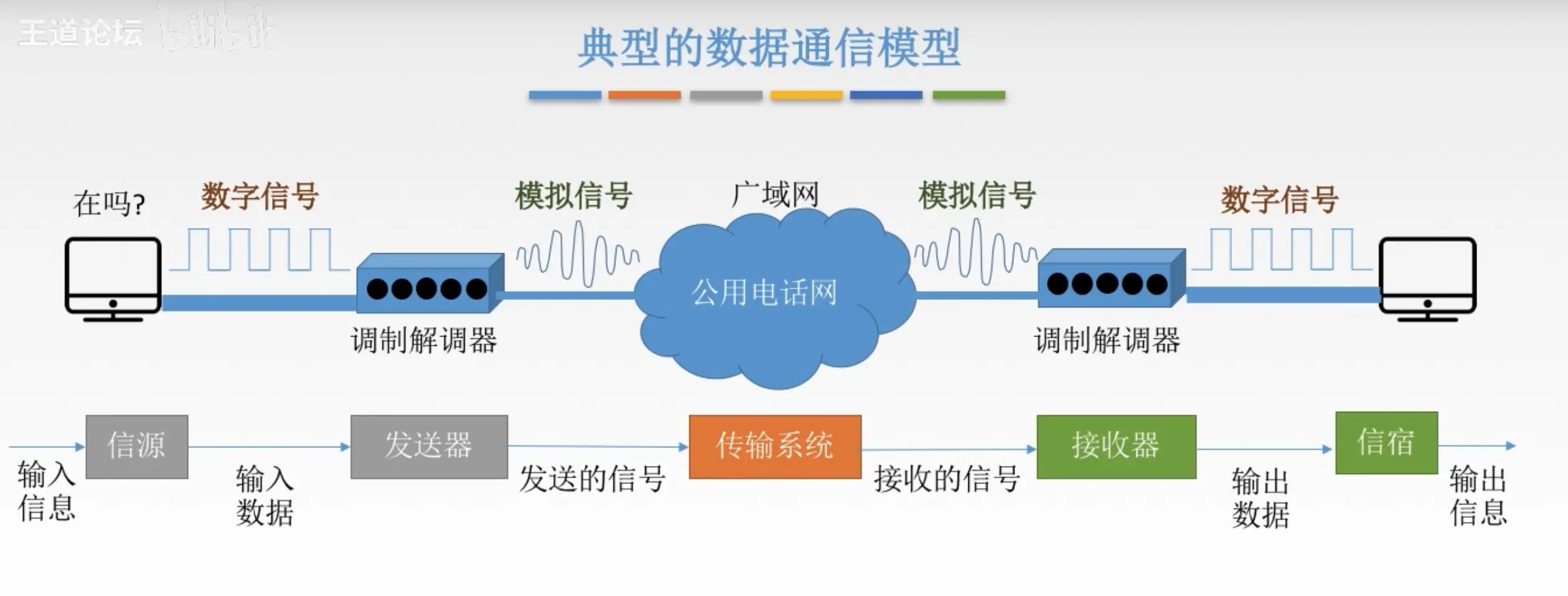 调制解调器:将传输媒体上的数字信号转换为模拟信号
