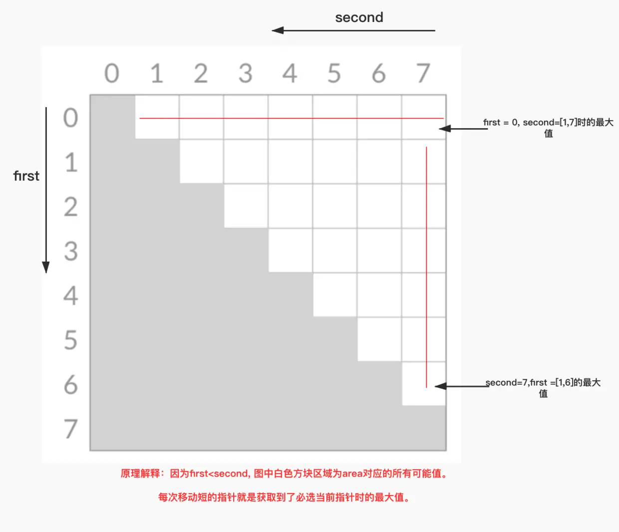 second - first的值不断变小,每次移动短的指针肯定是必选当前短的指针时的最大面积,也就是指针所在行或者列的最大值。所以这种移动方式是一定会 枚举到最大的Area 的。