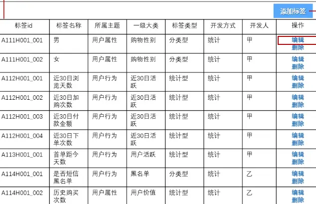 这里定义了标签的基本信息,开发方式,开发人员等等,在完成标签的开发以后,直接在此页面对标签进行录入,就可以完成标签的上线工作,让业务人员可以对标签进行使用。