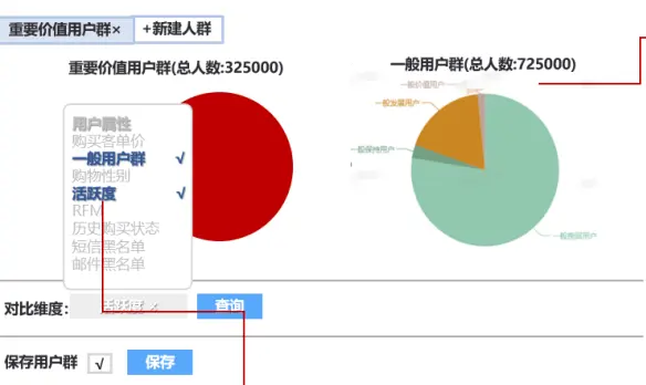 在此功能中,还可以增加人群对比的功能,对不同人群的不同标签进行圈定,对比。这对于查询性能也是一个巨大的考验。