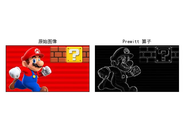 由于 Prewitt 算子采用 3 * 3 模板对区域内的像素值进行计算,而 Robert 算子的模板为 2 * 2 ,故 Prewitt 算子的边缘检测结果在水平方向和垂直方向均比 Robert 算子更加明显。Prewitt算子适合用来识别噪声较多、灰度渐变的图像。