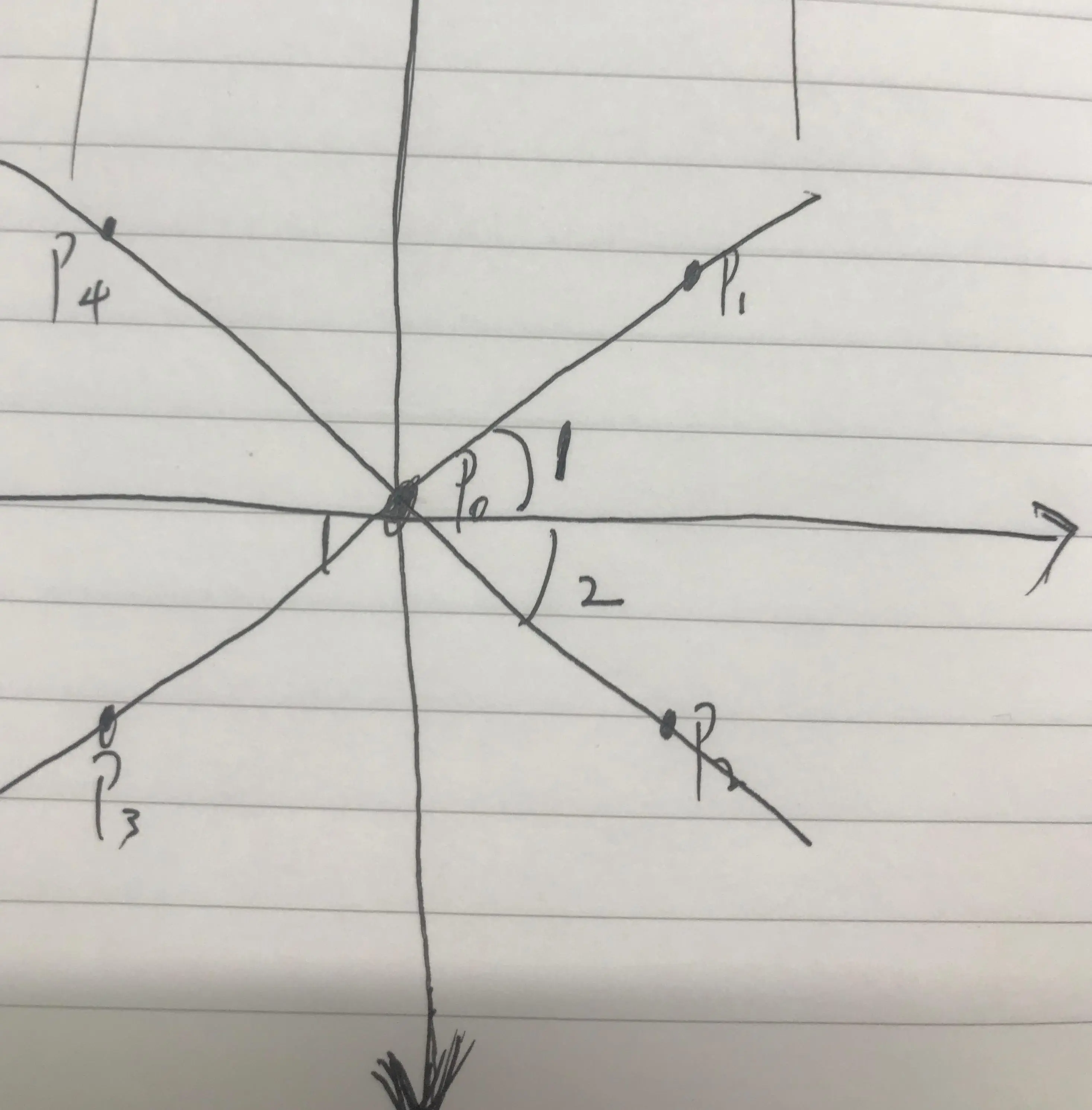 我们假设P0为前一个点,P1,P2, P3, P4分别为需要计算的点,在一个平面中,方向最多存在这4个方向,分别位于不同的象限中。