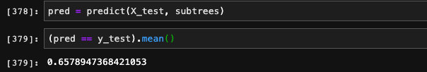 这些函数都实现之后就是predict方法了,根据Bagging的定义,对于每一个样本,我们都需要获取每一棵决策树的分类。然后选择其中数量最多的那个作为最终的预测结果,这段逻辑也不复杂,相信大家观看代码都能想明白。