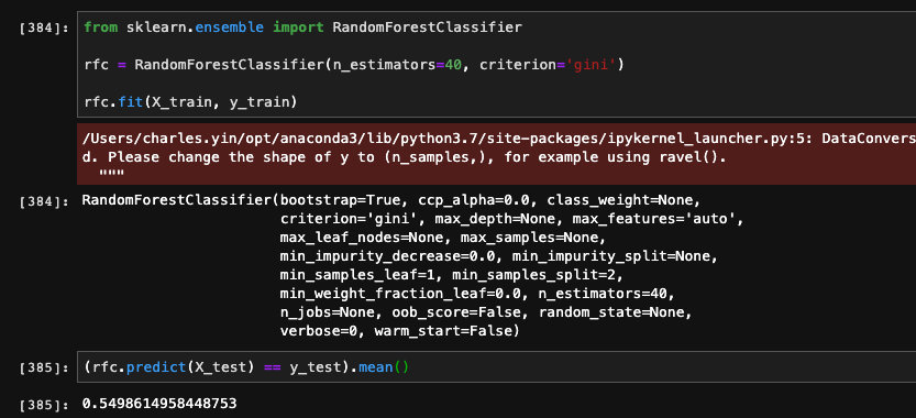 到这里其实都是决策树的部分,决策树实现了之后,构建森林的部分非常简单。只做了一件事,就是随机样本和特征,然后用随机出的样本和特征创建新的决策树并进行记录。