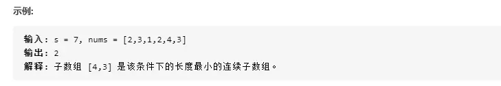 这道题我们可以维护一个队列,每当有新数组元素的时候,我们将其压入队列,并计算队列所有数字的总和sum,如果sum大于目标值,我们就与之前暂存的最小长度比较,如果小于最小长度,那就更新最小长度, 然后将队头元素出队列。