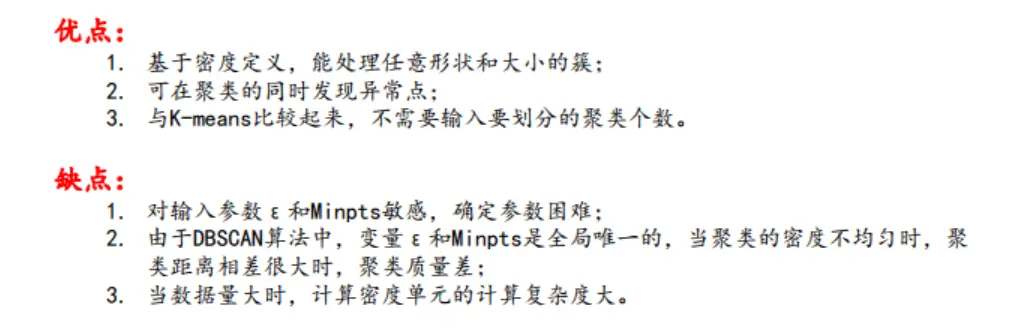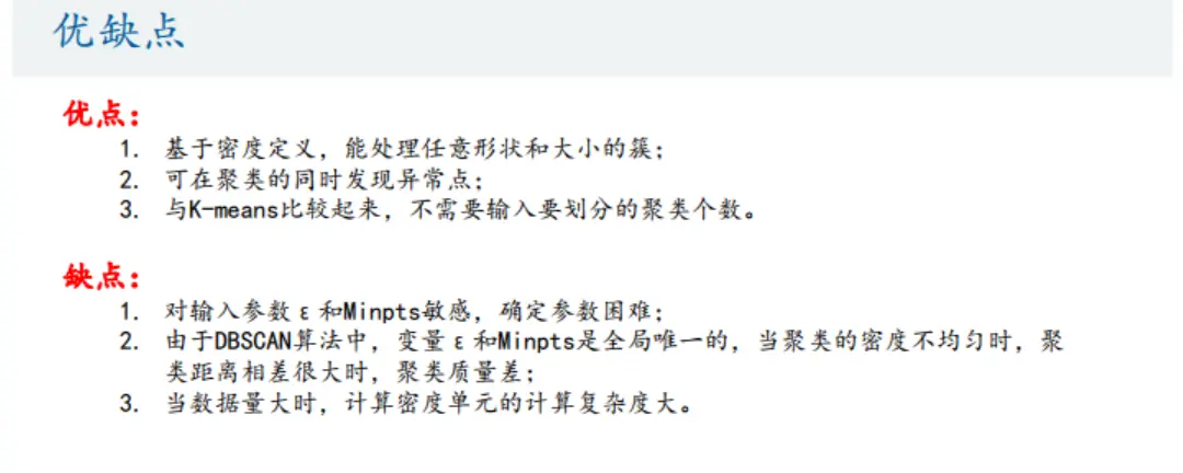 - k-means需要指定聚类簇数k,并且且初始聚类中心对聚类影响很大。k-means把任何点都归到了某一个类,对异常点比较敏感。 DBSCAN能剔除噪声,需要指定邻域距离阈值eps和样本个数阈值MinPts,可以自动确定簇个数。