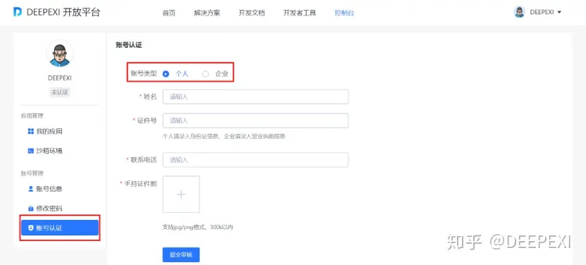 登录成功后自动进入控制台,点击左侧菜单「账号认证」可完成身份认证。支持个人和企业两种账号类型的认证。