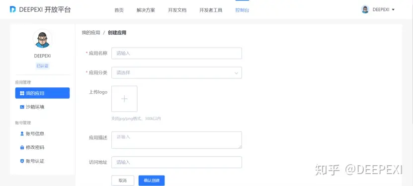 选择应用分类,填写应用名称、描述、访问地址,并上传 logo,「确认创建」该应用。