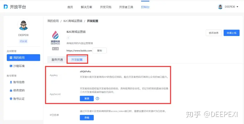 点击该应用进入详情,下方切换至「开发配置」,就能获取此应用的接入凭证 — AppKey 和 AppSecret。