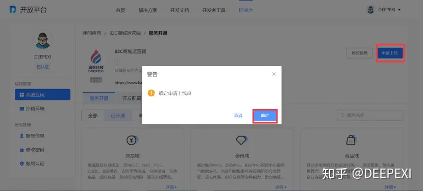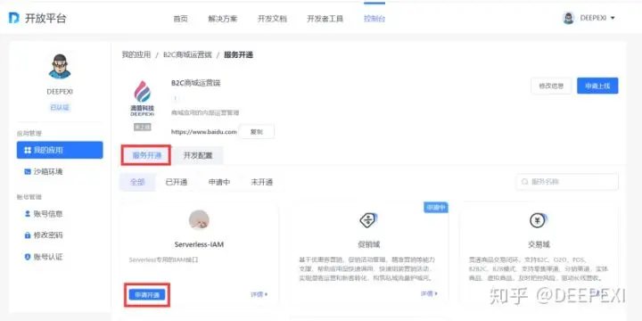 应用创建完成后,切换至「服务开通」,选择所要使用的服务「申请开通」提交申请。