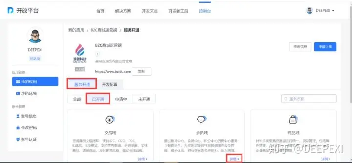 待商户运营端审核通过后,可在「服务开通」-「已开通」中查看该服务,在「详情」中查看 API 接口信息。