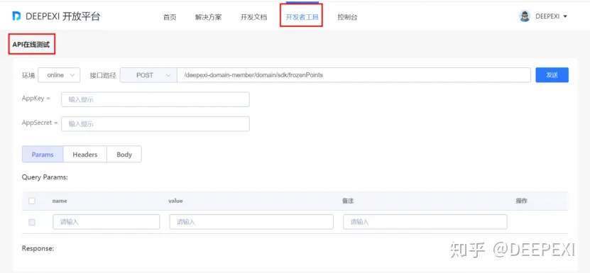 点击接口地址下方的「在线测试」,还可跳转进入「开发者工具」进行 API 在线测试。