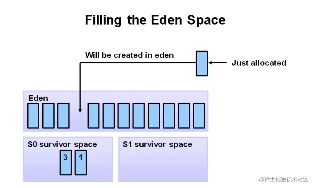 第一步:新分配的对象会放在伊甸园,伊甸园满了就会触发 minor gc,minor gc 会清除包括 s0 , s1 在内所有年轻代里面不用的垃圾。