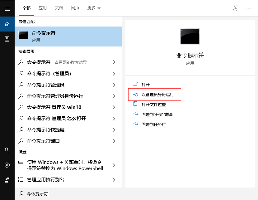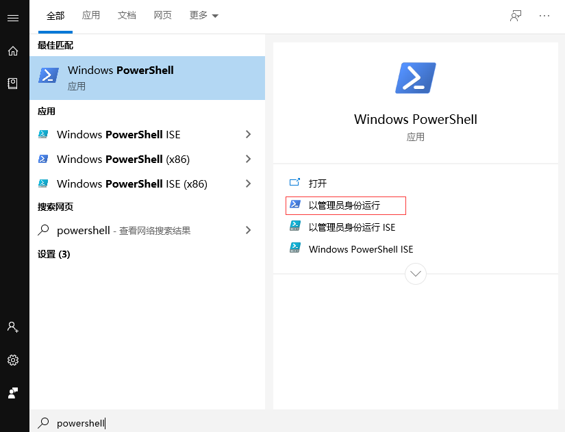 2.1. 在菜单中搜索“powershell”或者“命令提示符”,找到后以管理员身份运行,如下图: