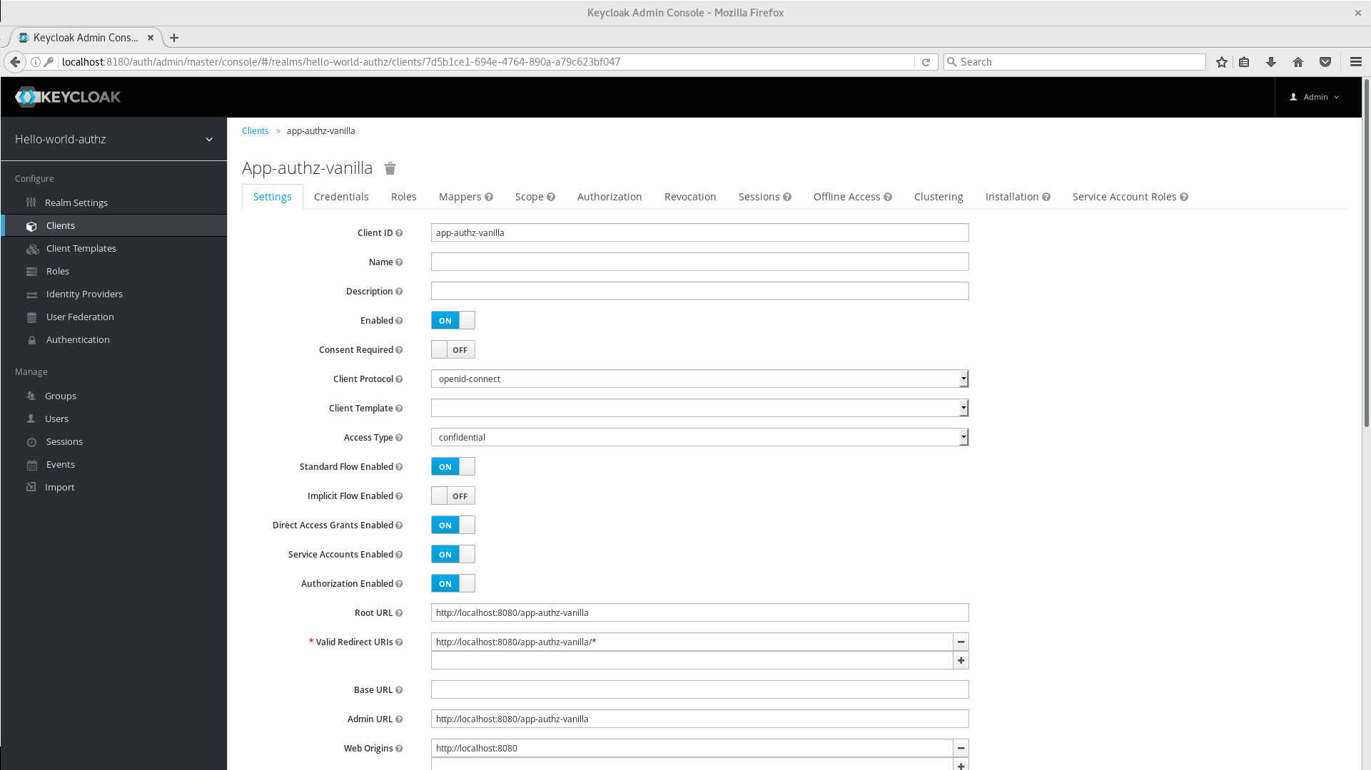 资源服务器可以使用Keycloak管理员控制台来管理。在那里,您可以将任何已注册的客户端启用为资源服务器,并管理其资源和范围。