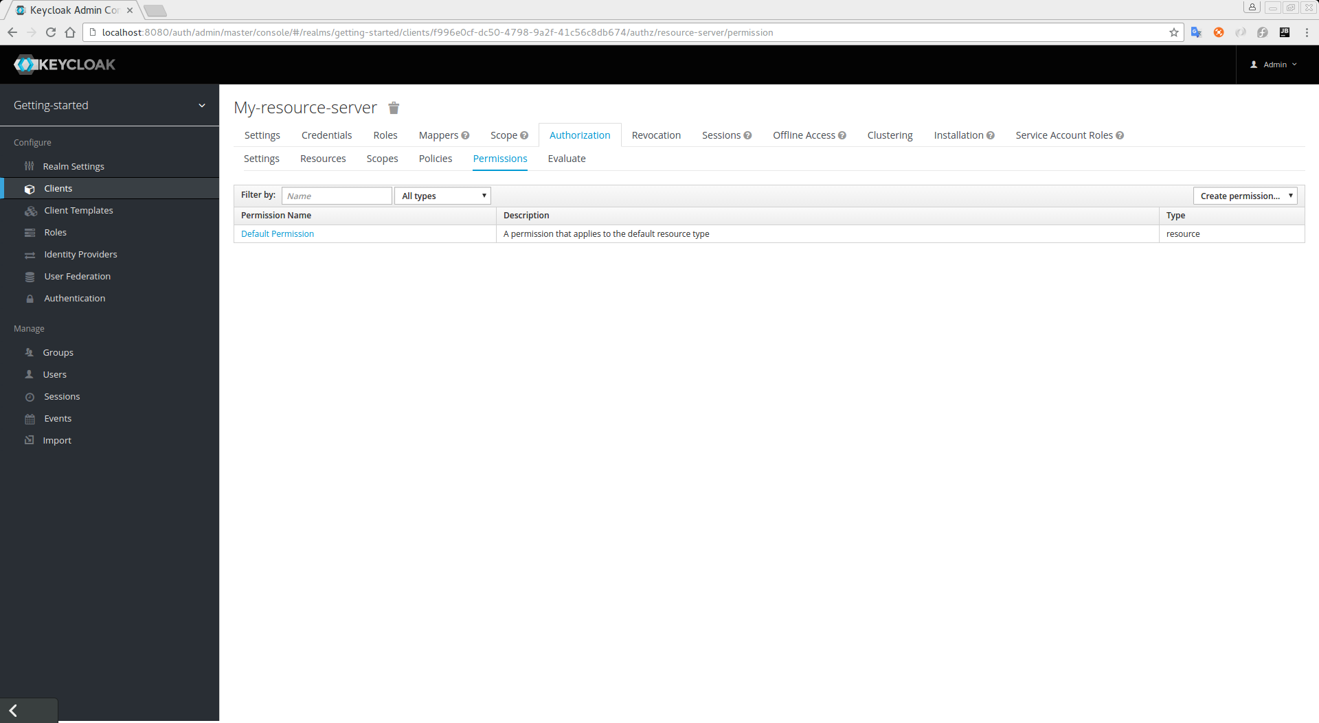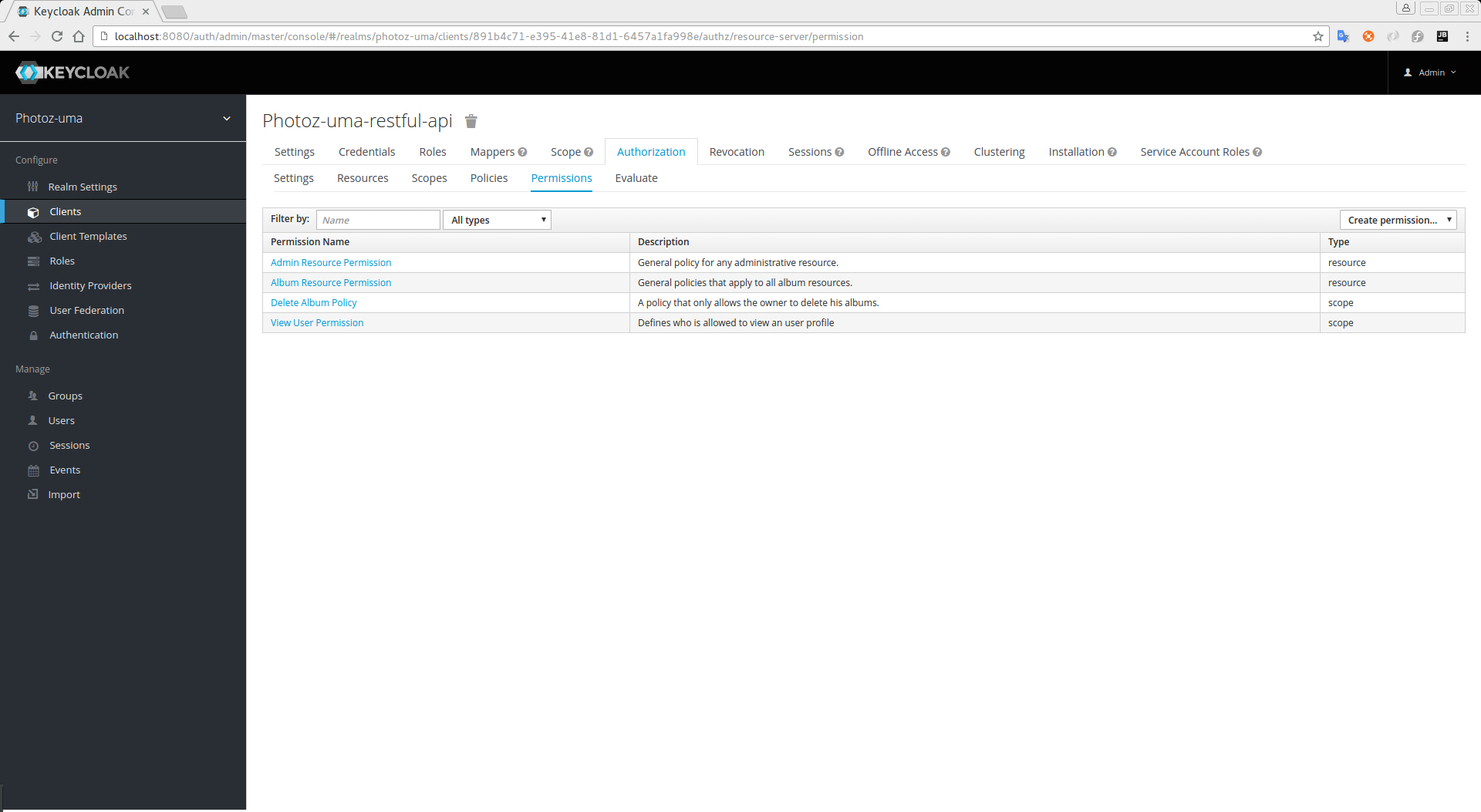 创建了资源和策略之后,我们现在来管理权限。点击Permissions选项卡: