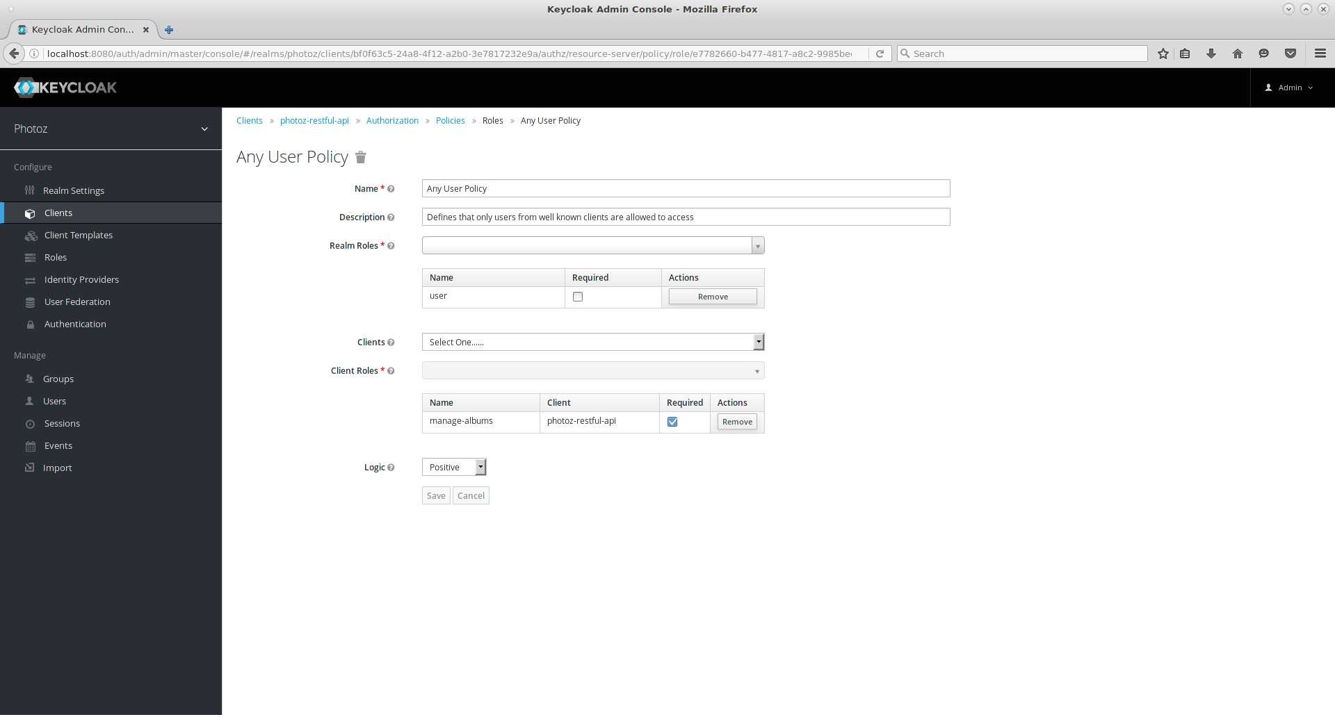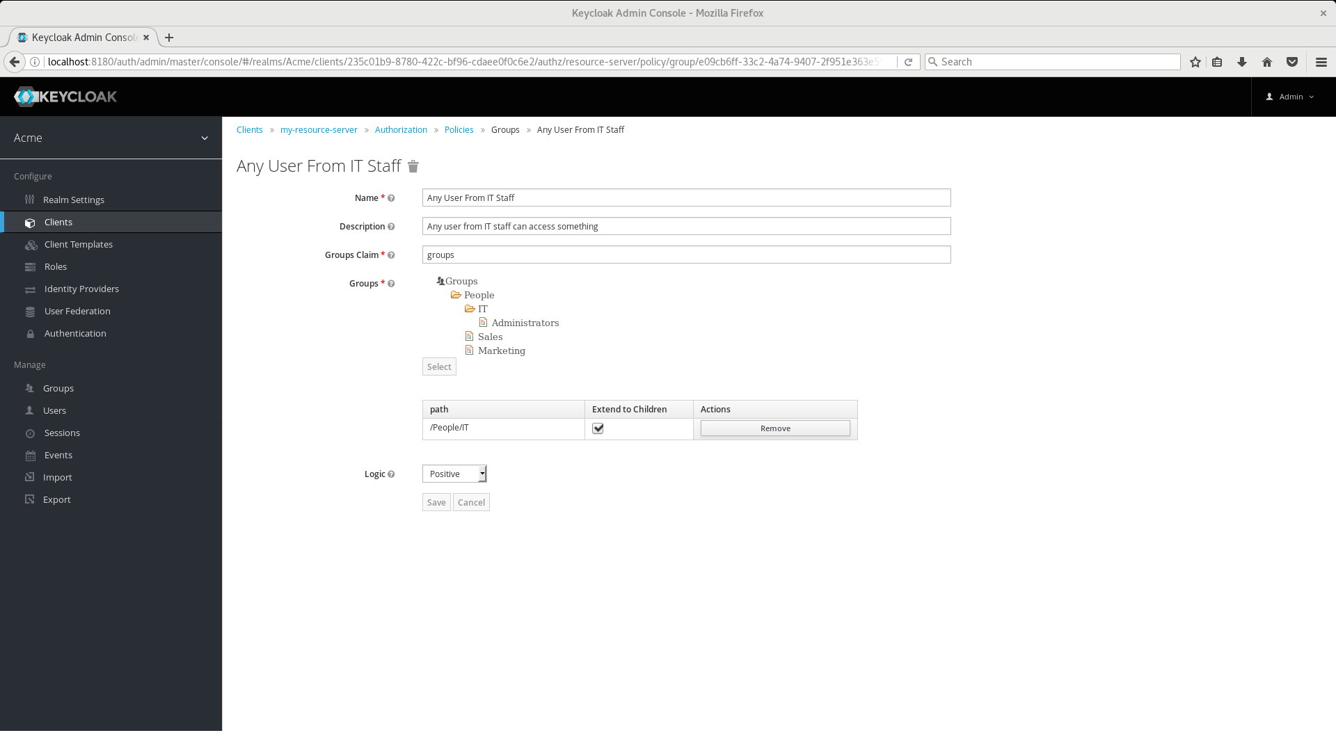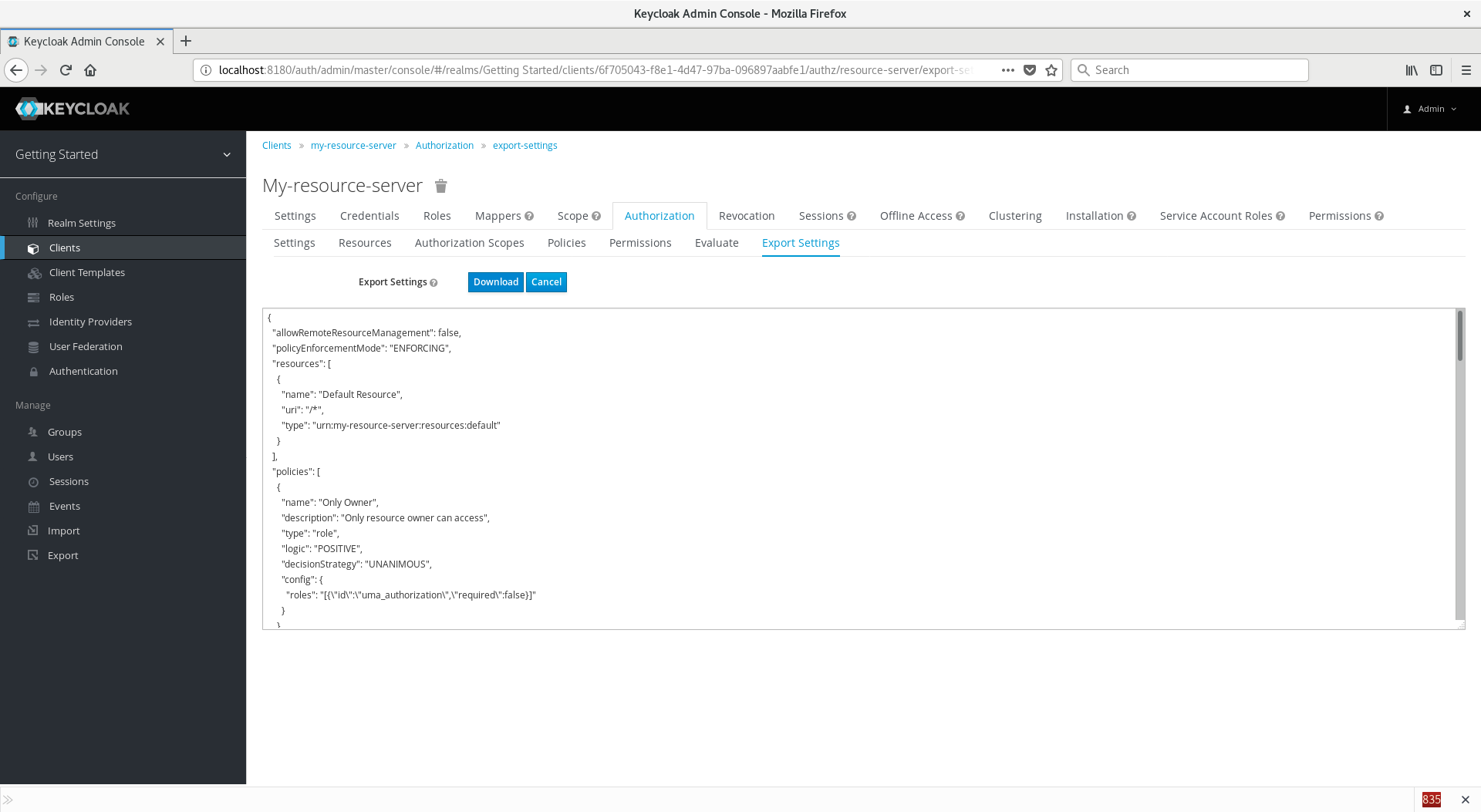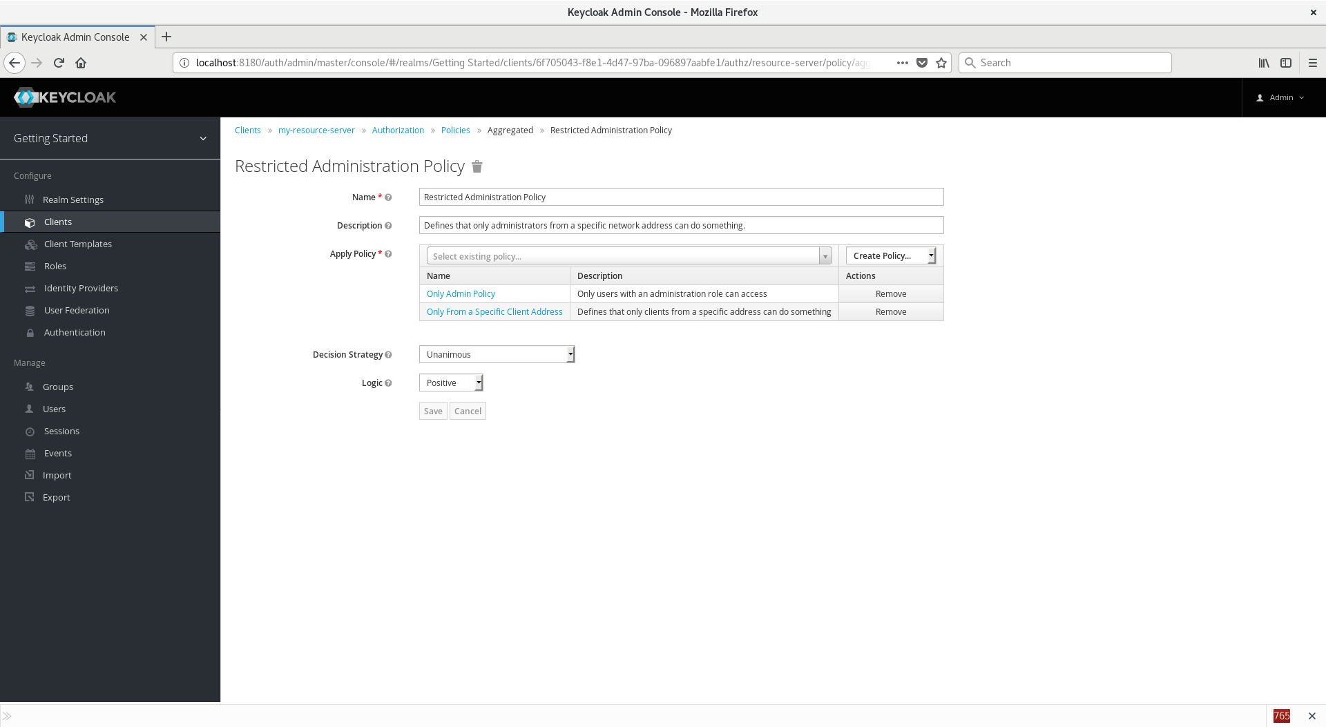 任何可信的Keycloak客户端都可以作为资源服务器。这些客户端的资源以及范围由一系列的授权策略保护。