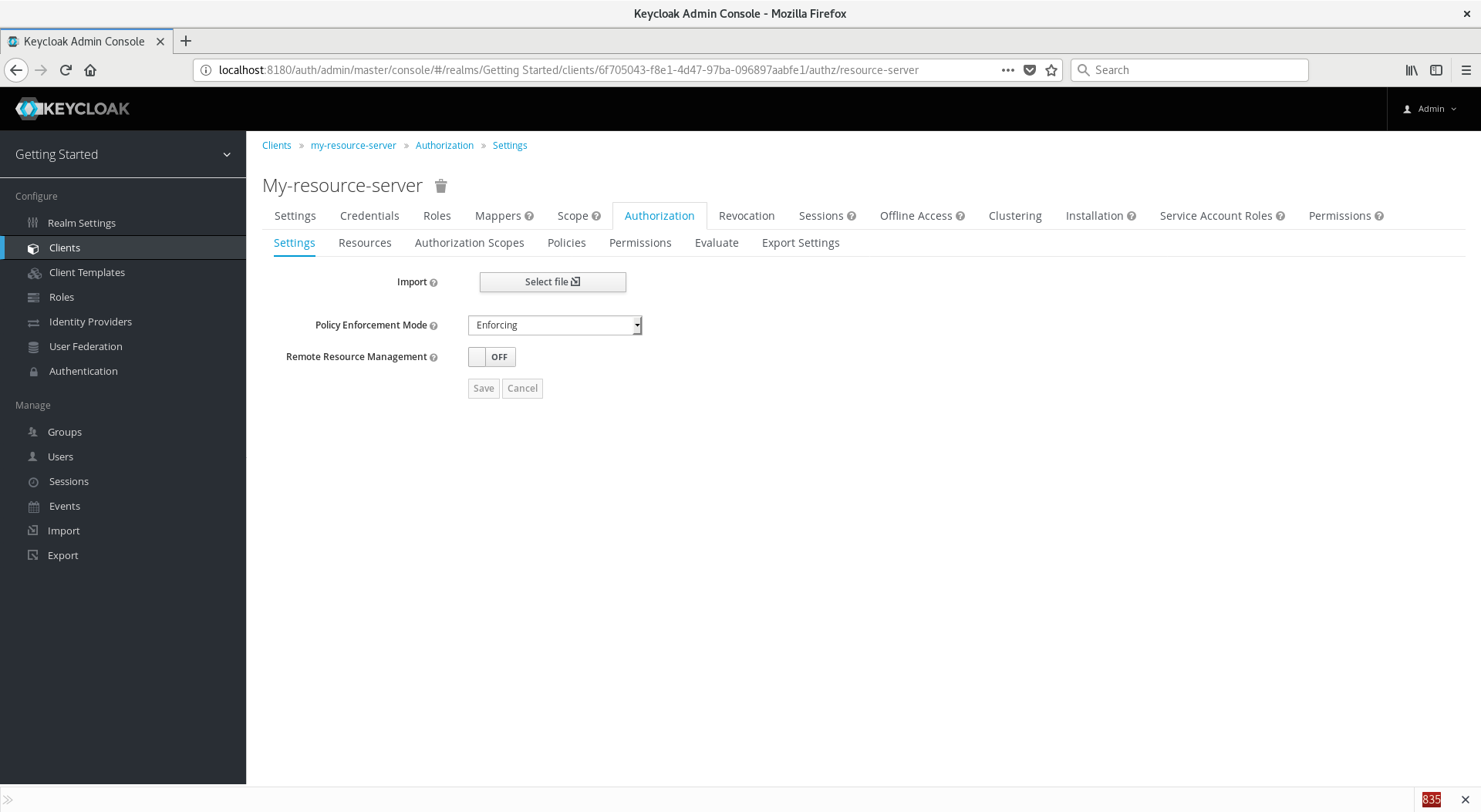 远程资源管理功能默认开启。可以通过Keycloak管理员控制台来关闭此功能。
