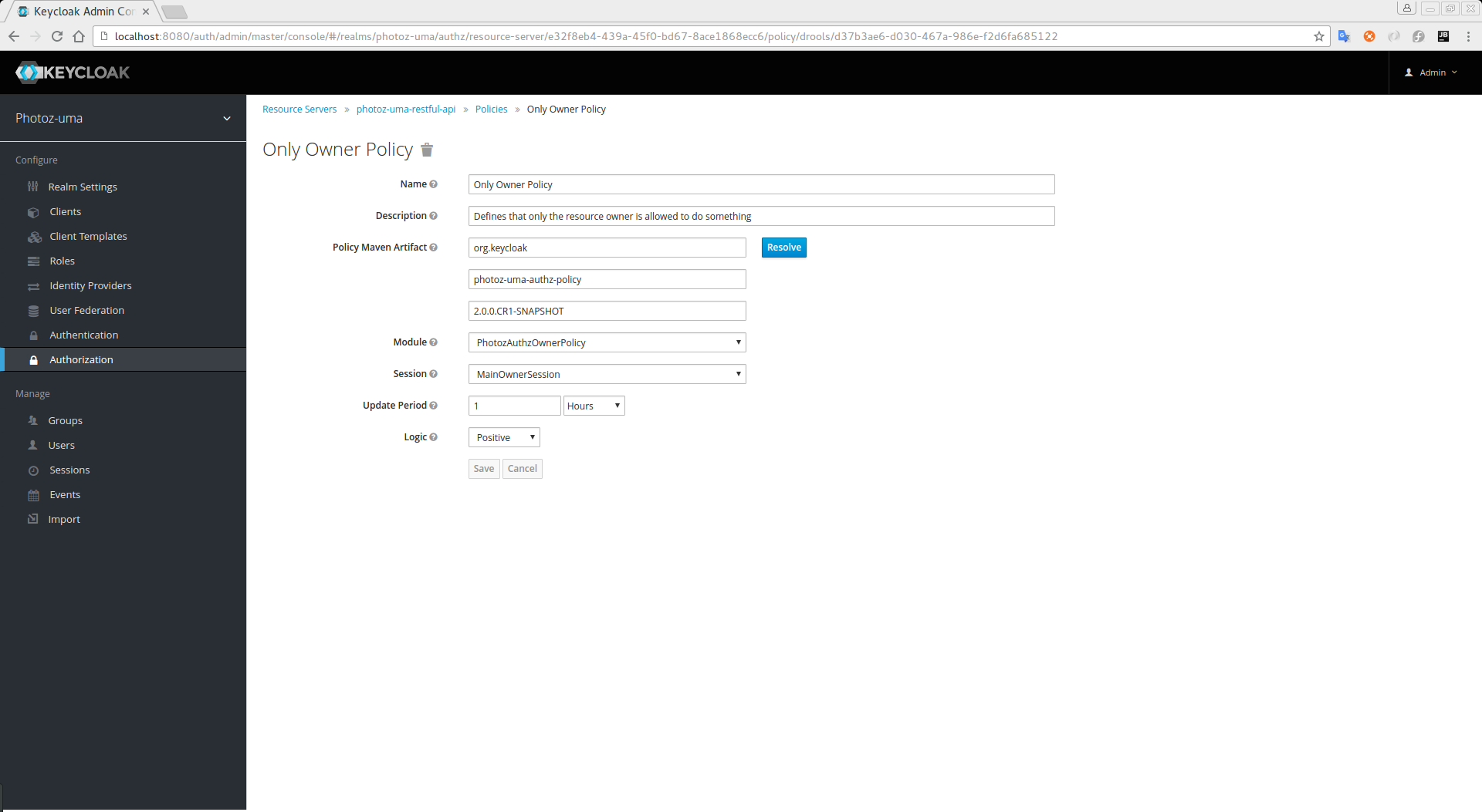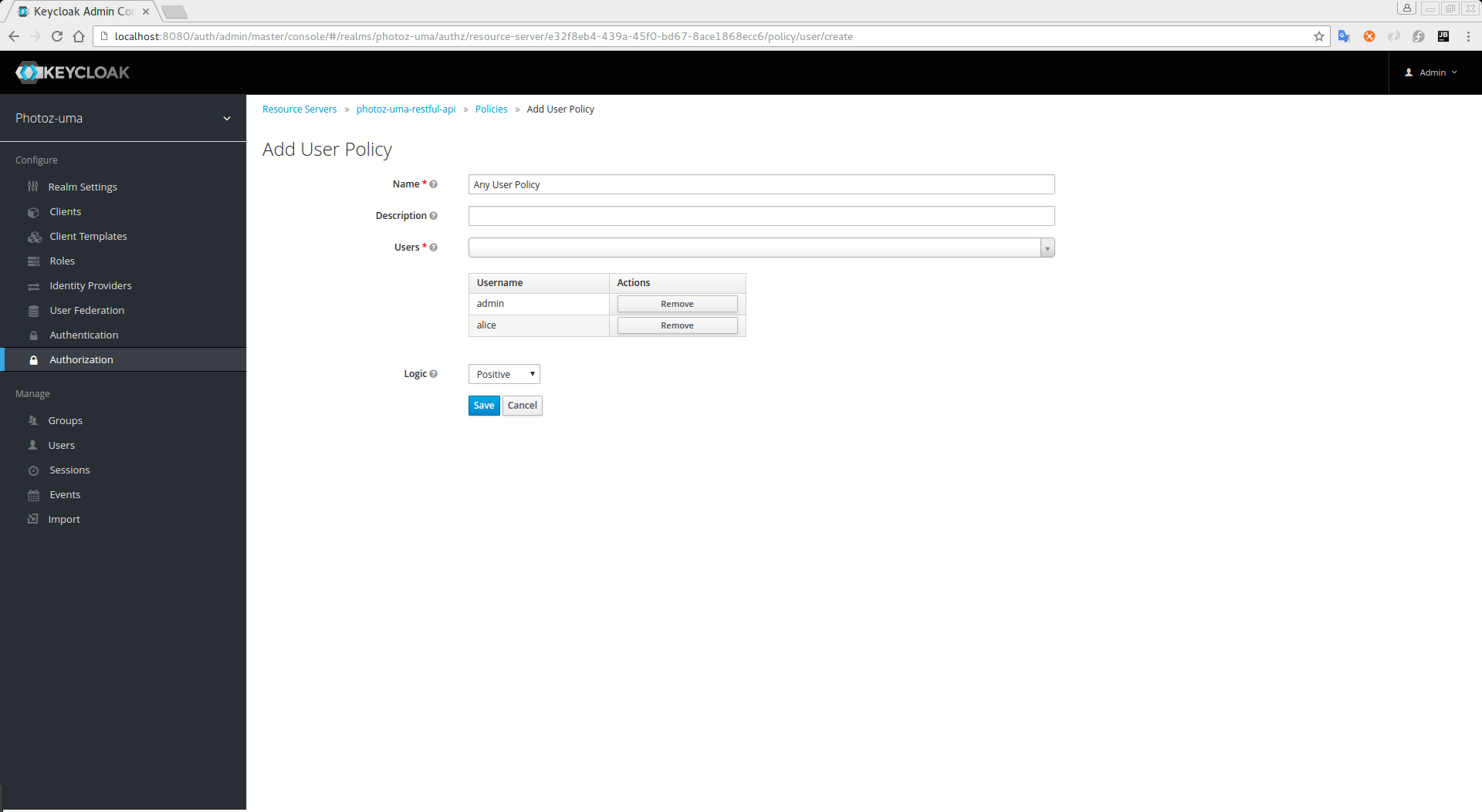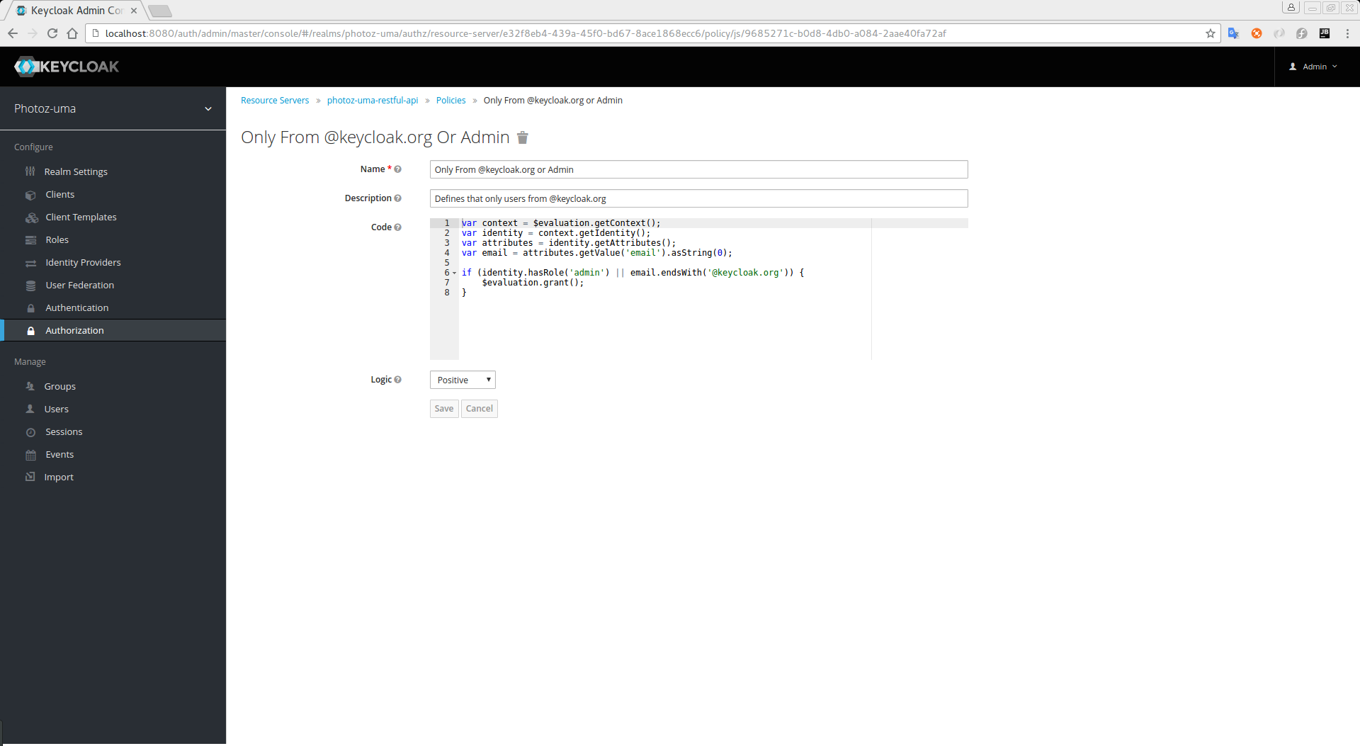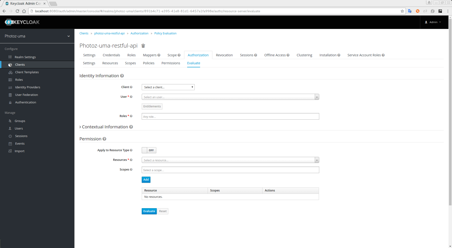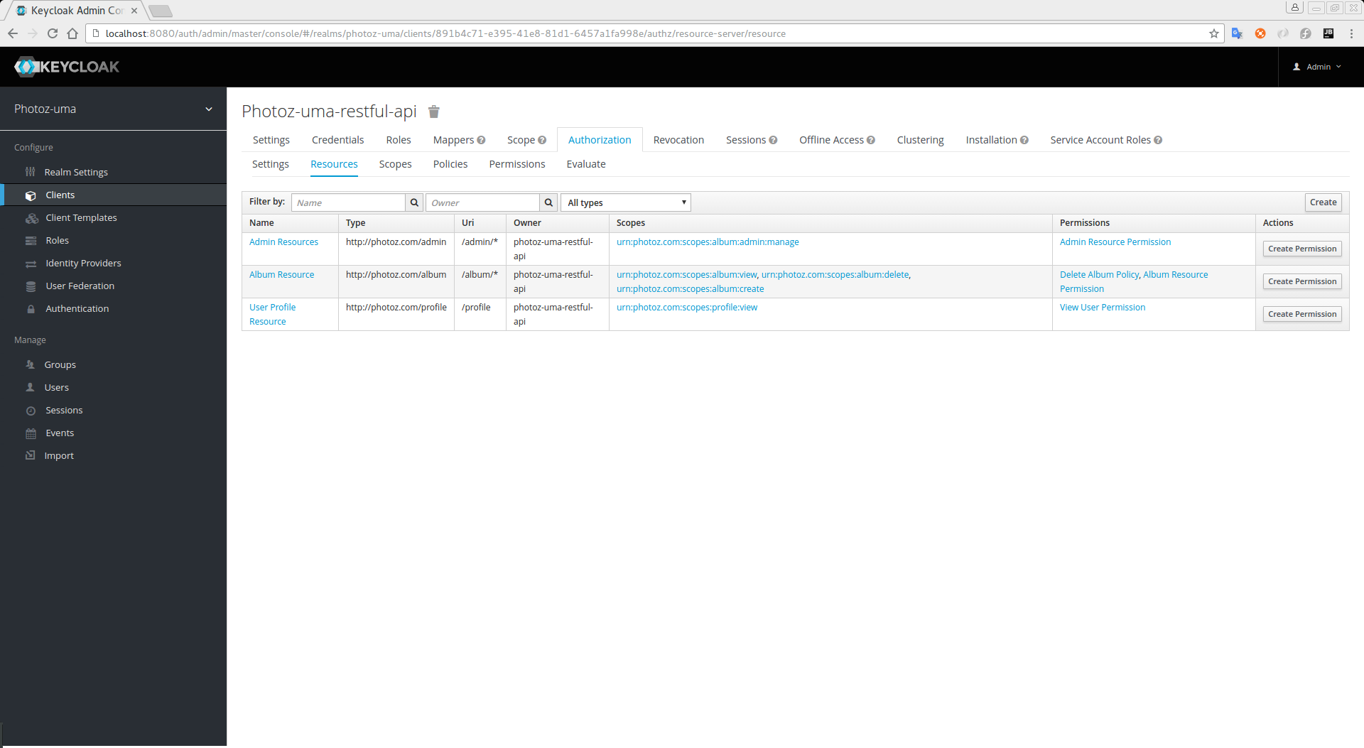 在Keycloak Admin的基础上提供了UI界面来管理资源服务器、资源、范围、权限以及策略。其中的部分功能也可以通过Protection API来实现。