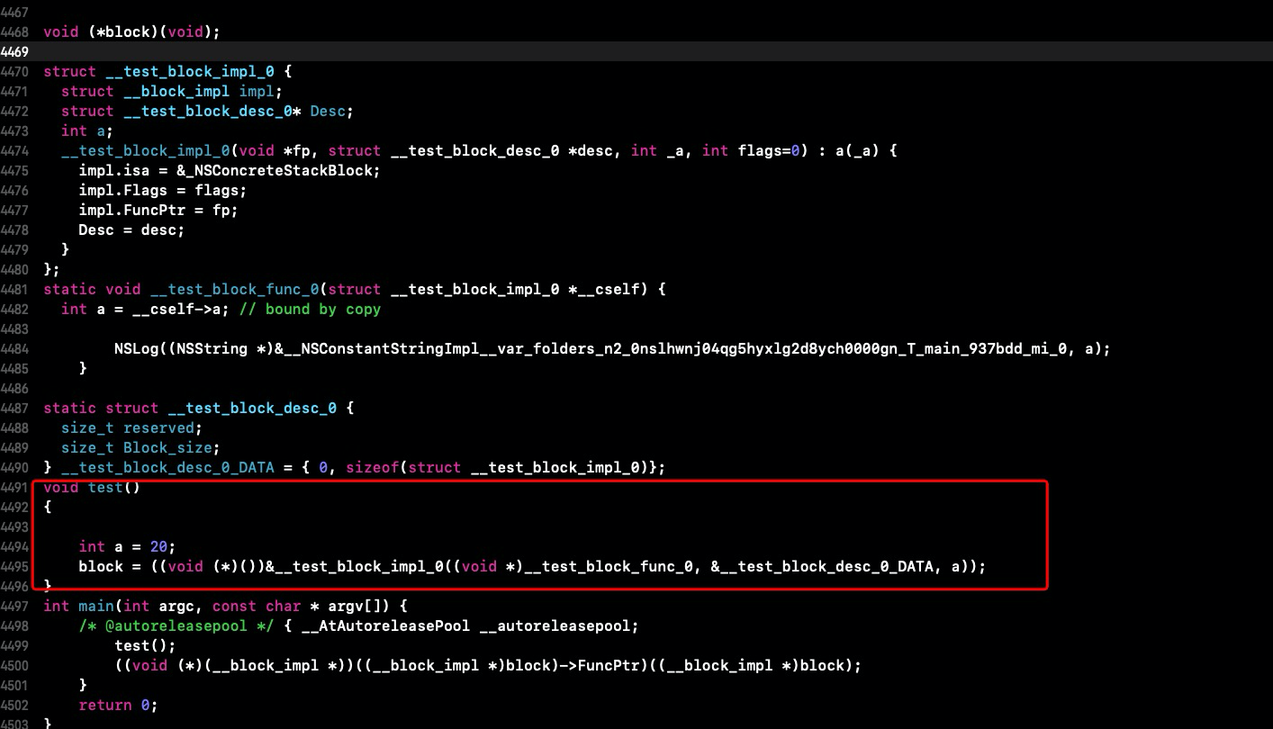 可以发现a的值变为了不可控的一个数字。为什么会发生这种情况呢?因为上述代码中创建的block是__NSStackBlock__类型的,因此block是存储在栈中的,那么当test函数执行完毕之后,栈内存中block所占用的内存已经被系统回收,因此就有可能出现乱得数据。查看其c++代码可以更清楚的理解