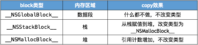 通过打印的内容可以发现正如上图中所示。 没有访问auto变量的block是__NSGlobalBlock__类型的,存放在数据段中。 访问了auto变量的block是__NSStackBlock__类型的,存放在栈中。 __NSStackBlock__类型的block调用copy成为__NSMallocBlock__类型并被复制存放在堆中。