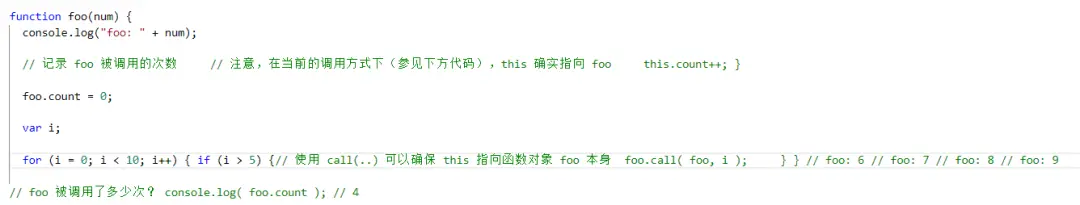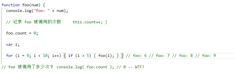 执行 foo.count = 0 时,的确向函数对象 foo 添加了一个属性 count。但是函数内部代码 this.count 中的 this 并不是指向那个函数对象,所以虽然属性名相同,根对象却并不相 同,困惑随之产生。