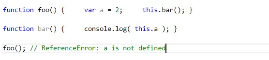 此外,编写这段代码的开发者还试图使用 this 联通 foo() 和 bar() 的词法作用域,从而让 bar() 可以访问 foo() 作用域里的变量 a。这是不可能实现的,你不能使用 this 来引用一 个词法作用域内部的东西。