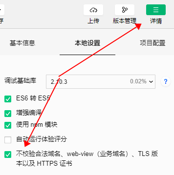 **小程序的域名必须是配置HTTPS的,一般开发中我们会勾选不校验合法域名,或者是链接本地做调试 **