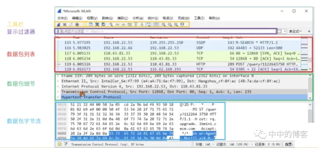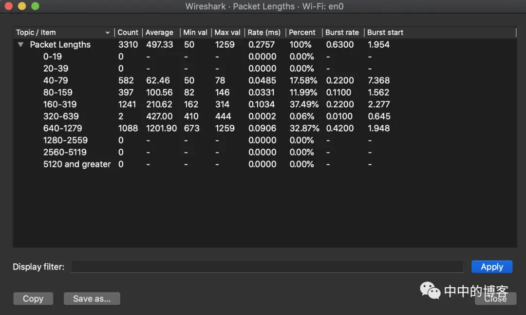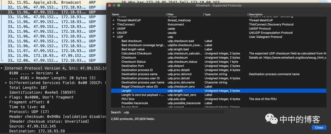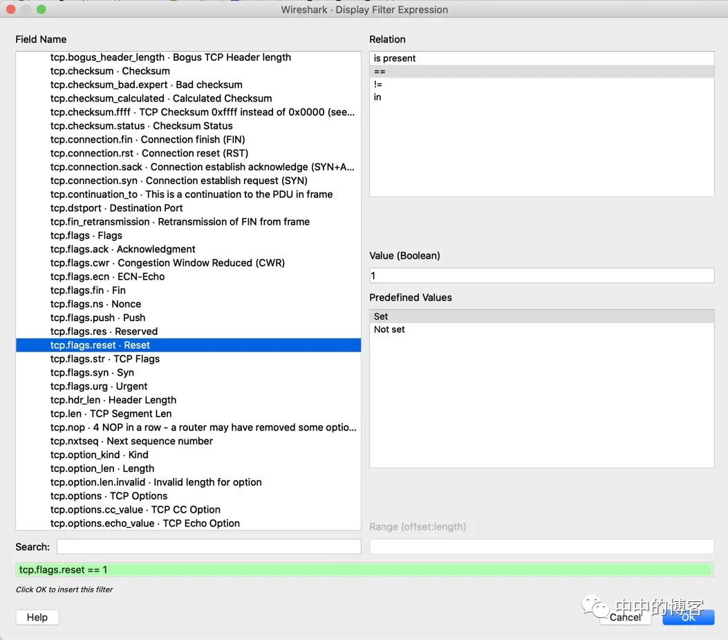 wireshark提供了可视化的过滤表达式的工具,如果不熟悉可以在工具栏调出(MAC环境:Analyze -> Display Filter Expression)