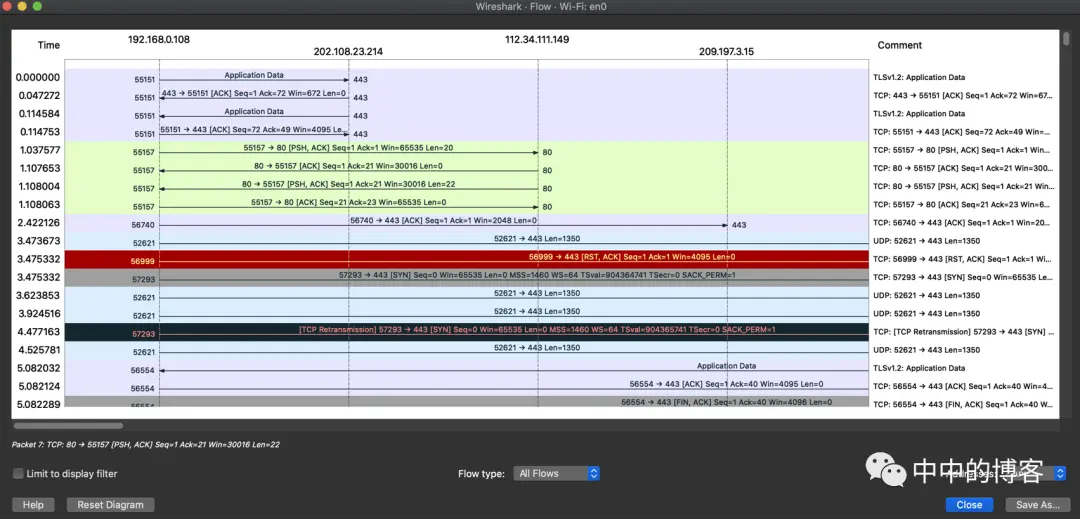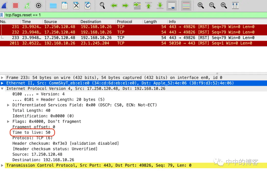 3.分析包RST信号,如果是路由器直接断开连接,那么TTL会是64(不同的系统可能不相同,不同的网络设备实现也可能不相同,断开连接或者拒绝SYN转发等),而非服务端或者中间其他节点