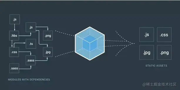 左侧:moduls with dependencies(具有依赖性的模块) 右侧:static assets(静态资源/资产)