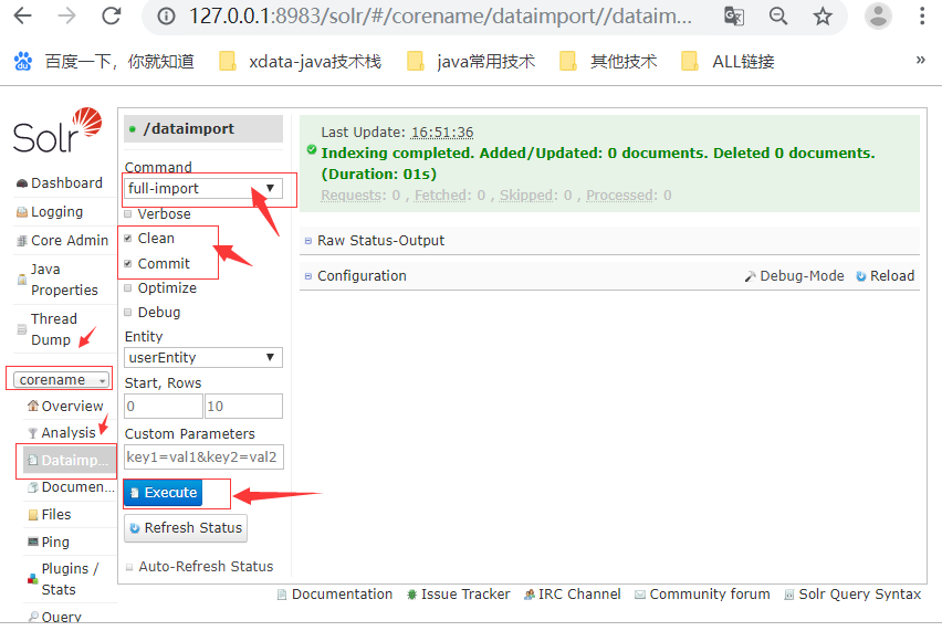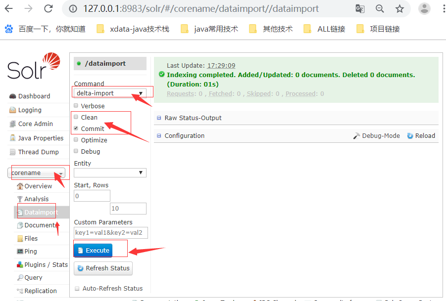 在浏览器直接输入网站 : http://127.0.0.1:8983/solr/#/corename/dataimport//dataimport 记住:clean=false、commit=true