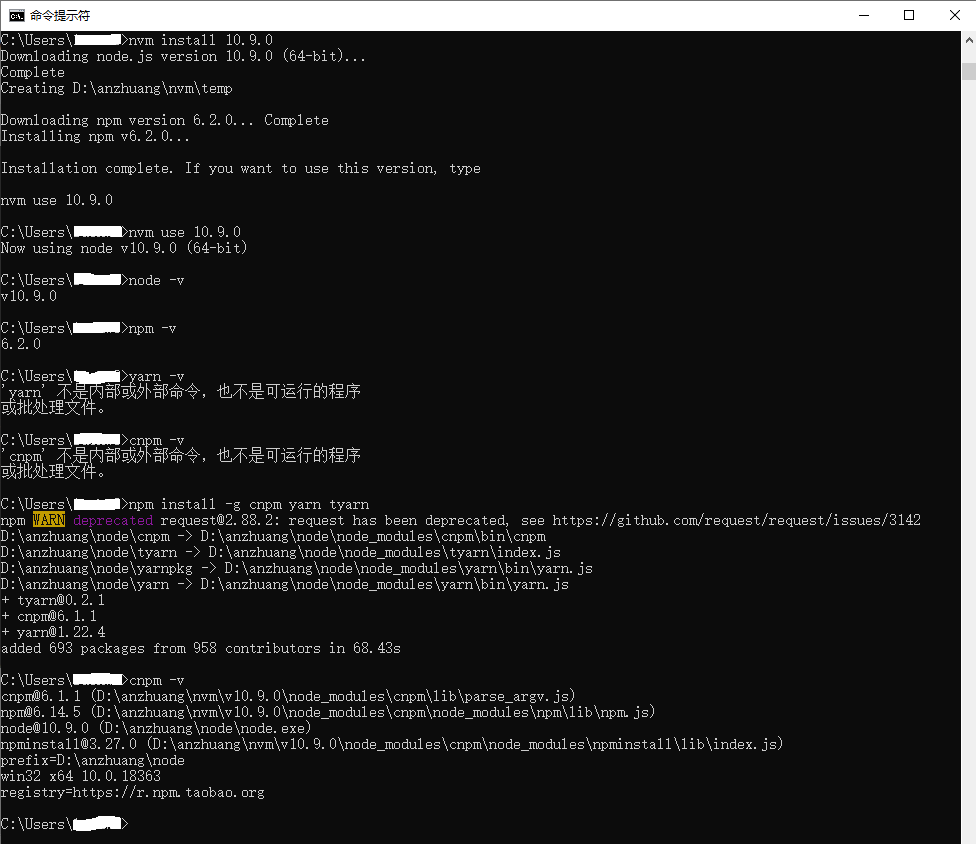 使用nvm use切换不同的node,需要重新安装cnpm, yarn, tyarn(因为不同的node版本对应不同的npm,cnpm,yarn,tyarn),具体操作可参考下图。