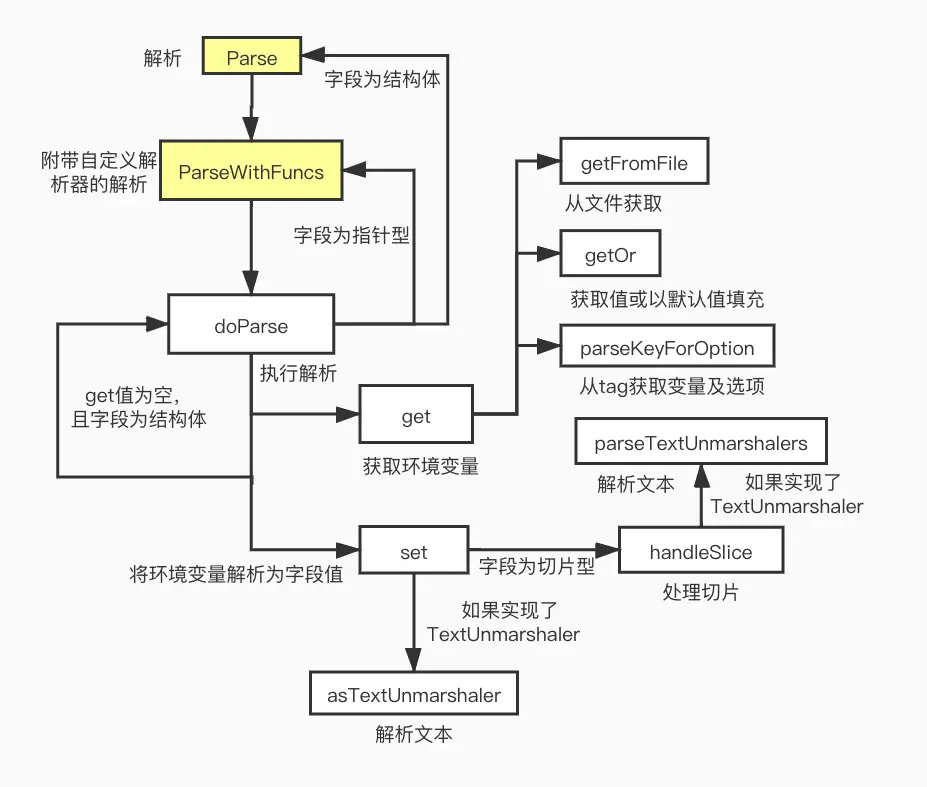 如下图,env库给外部主要暴露了 Parse 和 ParseWithFuncs 两个方法,Parse 方法其实只是封装了一层 ParseWithFuncs 方法,给了他一个空的自定义解析方法Map。ParseWithFuncs 会将传入的自定义解析方法和库中定义的解析方法合并,然后调用 doParse 方法来做解析,doParse 方法遍历结构体下的所有字段,如果为指针型会继续调用 ParseWithFuncs 解析,如果为结构体,则会继续调用 Parse 方法解析。在具体的解析阶段,会先调用 get 方法获取环境变量的值, get 方法会根据前面设定的标签的属性和选项等取得相应的值,然后通过 set 方法将赋值到对应的字段上,在 set 方法中还会判断是否是切片类型,或者是否实现了 TextUnmarshaler 接口,来做对应的处理。