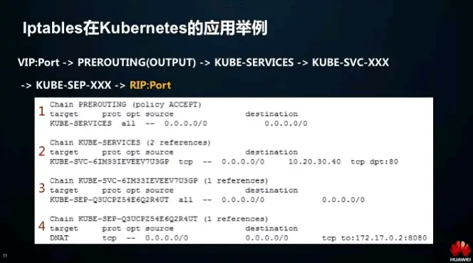 那么,在 Kubernetes 里面是怎么用 Iptables 来实现负载均衡呢?来看一个实际的例子。在 Kubernetes 中,从VIP到RIP,中间经过的Iptables链路包括:PREROUTING/OUTPUT(取决于流量是从本机还是外机过来的)-> KUBE-SERVICES(所有 Kubernetes 自定义链的入口)->KUBE-SVC-XXX(后面那串 hash 值由 Service 的虚 IP 生成)->KUBE-SEP->XXX(后面那串 hash 值由后端 Pod 实际 IP 生成)。