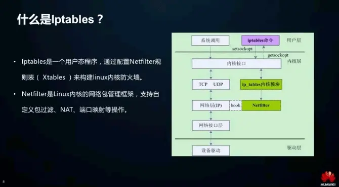 Iptables 主要分两部分,一个是它的命令行工具,在用户态;然后它也有内核模块,但本质上还是通过 Netfilter 这个内核模块来封装实现的,Iptables 的特点是支持的操作比较多。