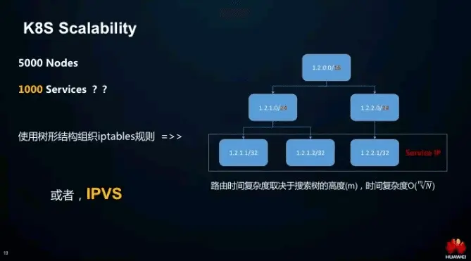 - 首先是时延,匹配时延和规则更新时延。我们从刚刚的例子就能看出,每个 Kubernetes Service 的虚 IP 都会在 kube-services 下对应一条链。Iptables 的规则匹配是线性的,匹配的时间复杂度是 O(N)。规则更新是非增量式的,哪怕增加/删除一条规则,也是整体修改 Netfilter 规则表。