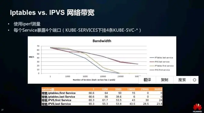 这是我们用 iperf 实测得到两种模式下的网络带宽。可以看到 Iptables 模式下第一个 Service 和最后一个 Service 的带宽有差异。最后一个 Service 带宽明显小于第一个,而且随着 Service 基数的上升,差异越来越明显。
