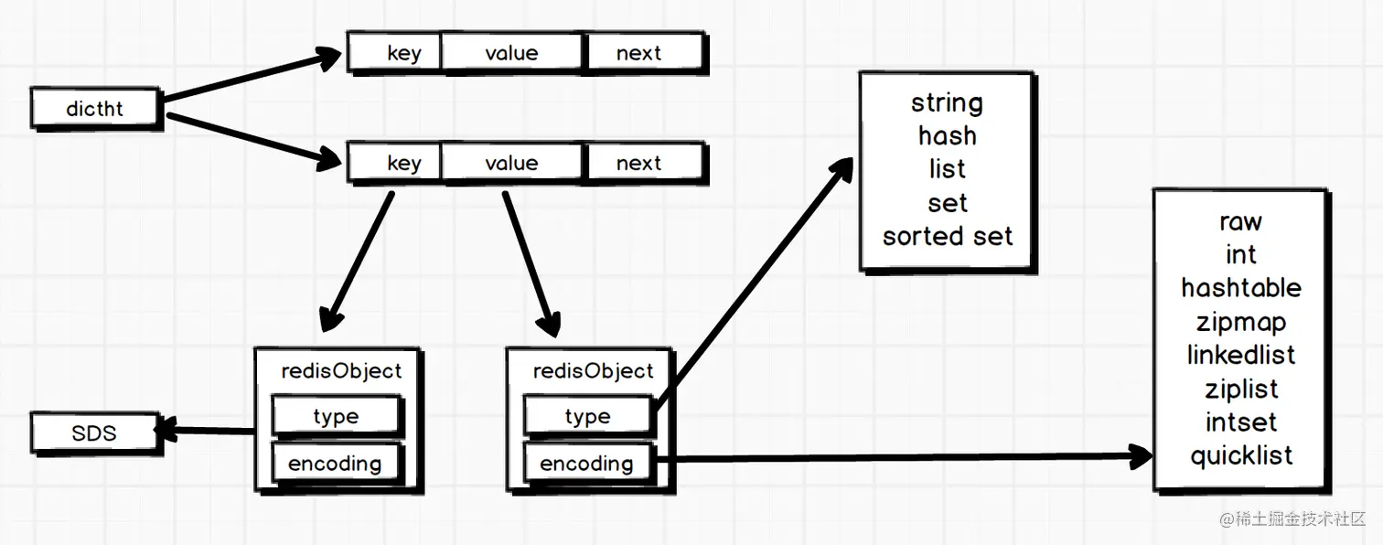 - string,内部通过SDS(Simple Dynamic String)来存储,SDS类似于Java中的ArrayList,可通过预分配冗余空间的方式减少内存的频繁分配