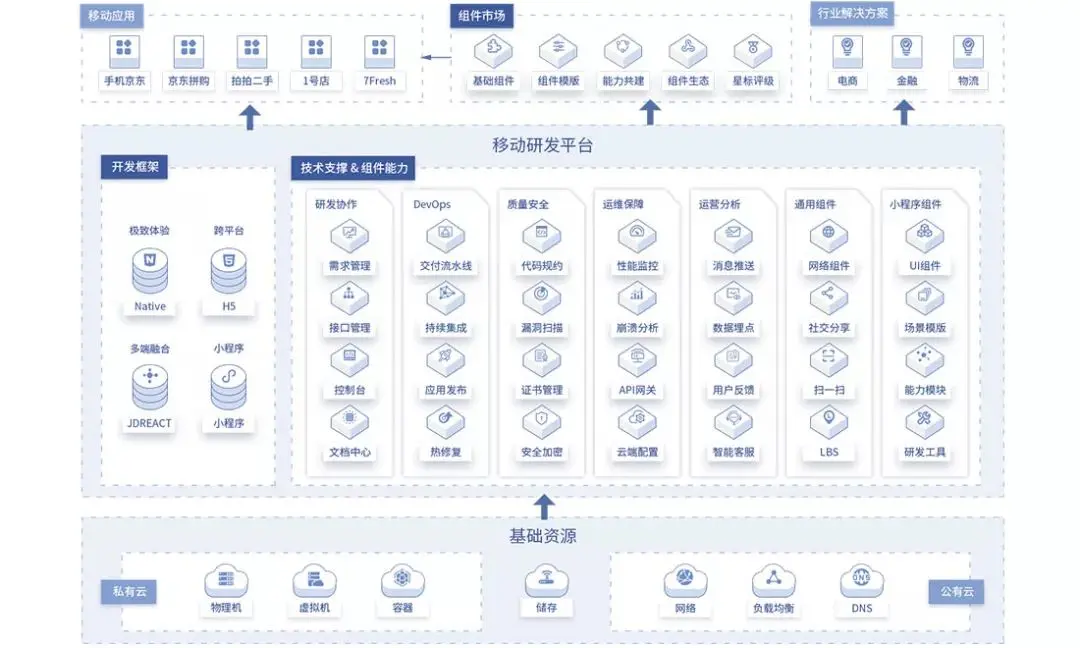 - 基础能力组件: 平台提供网络、图片、定位、存储、UUID等App所需的基础能力组件,所有组件经历京东复杂业务及大流量验证,提供完善的接入使用指导,用户可以自主选择快速复用京东成熟、稳定的技术能力。